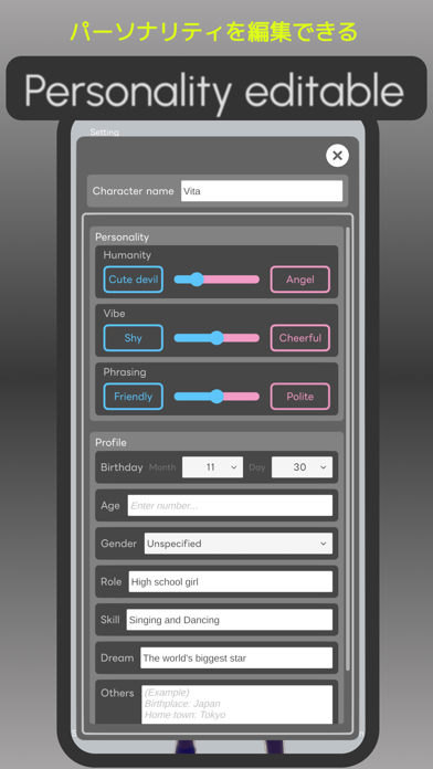 - 小悪魔、陽気、フレンドリーなど、性格や趣味を自分好みに変えられる