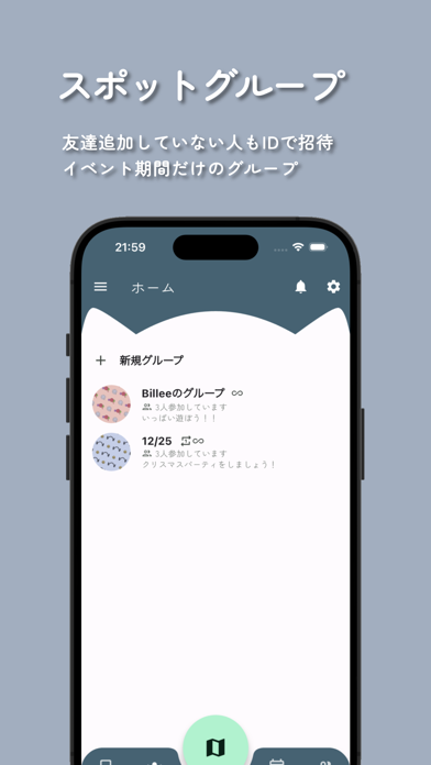 わざわざグループを残すほどでもない待ち合わせにも対応。イベント期間限定の「スポットグループ」というグループを作成できます。イベント期間中のみ位置情報共有とチャットが利用可能。イベント期間後はログが残らず、お互いに位置情報を知られることもありません。