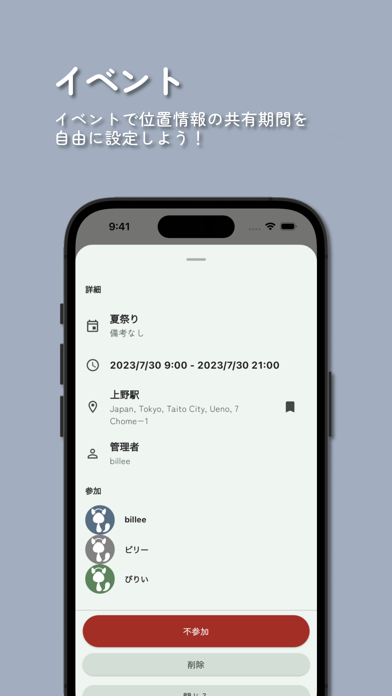 アプリ内でイベントを作成し、その「イベントの期間中」のみ参加者同士で位置情報を共有できる仕組み。位置情報の共有に抵抗がある人も、よりスムーズな待ち合わせが望めるのです。