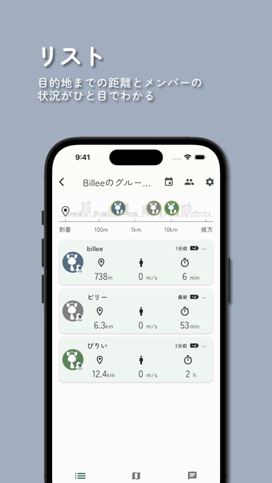 イベントの期間限定で、友達と位置情報を共有し合えます。詳細な場所がわかるマップと、自分からの大まかな距離がわかるリストで互いの位置を確認可能。