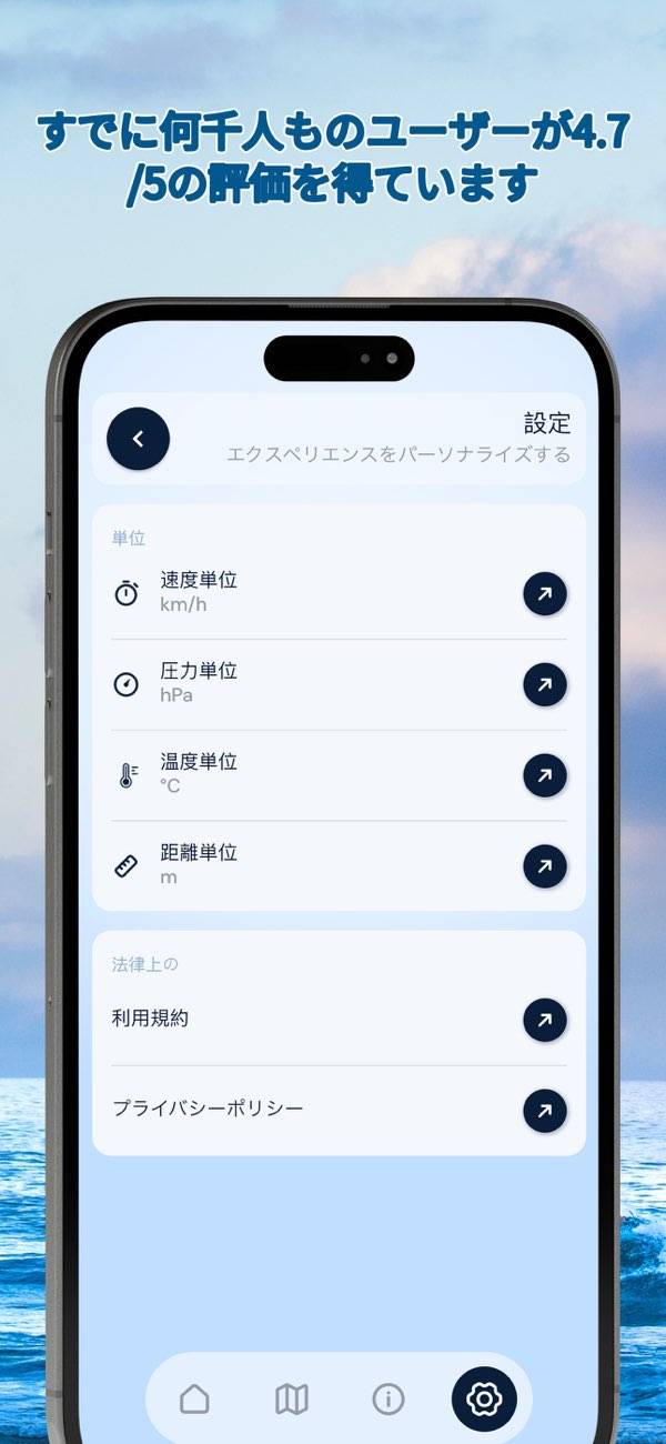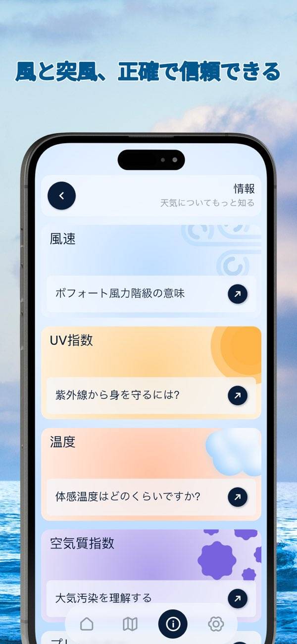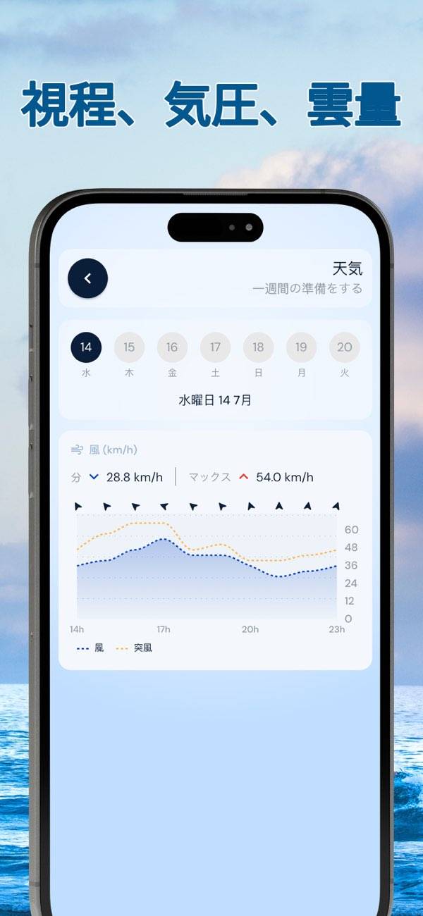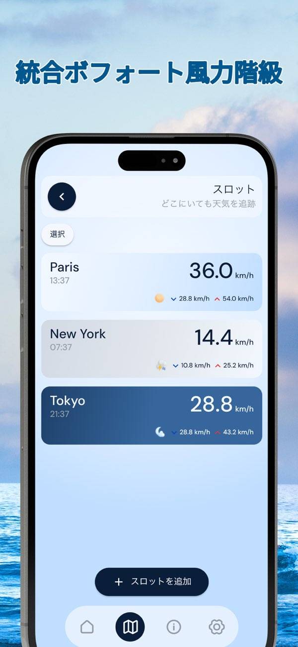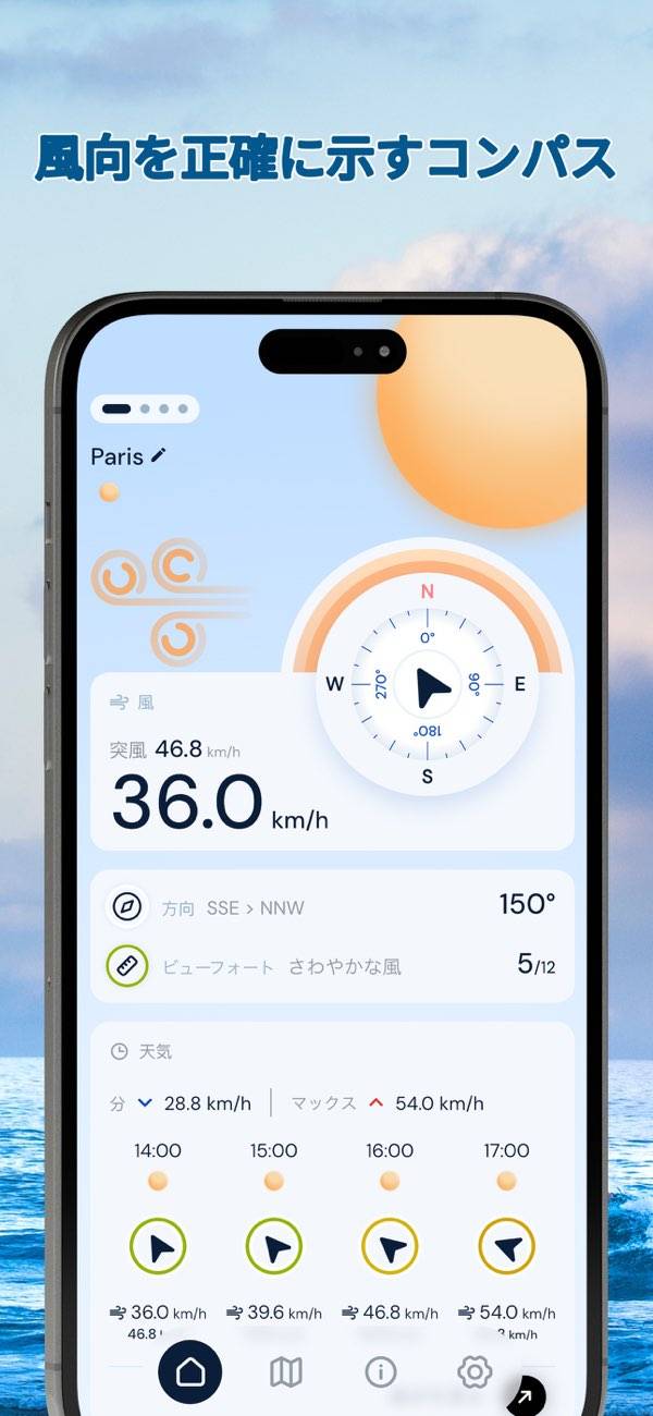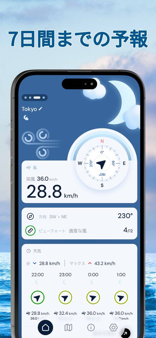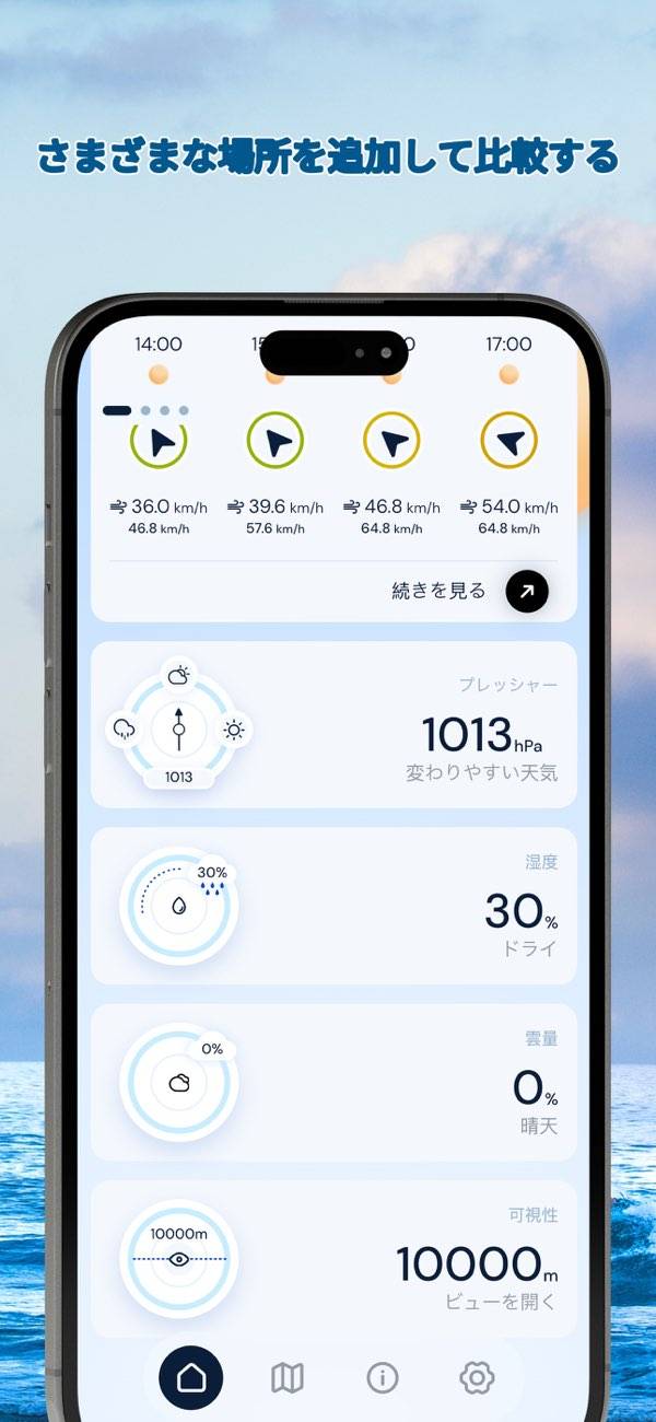 登山やキャンプなどのアウトドア活動で風の強さを確認する際に役立ちます。複数の地点を登録可能で、正確なデータを瞬時に取得できます。本アプリは風の情報に特化しており、波の高さや天気まではわからないので注意。風の情報だけ取得できるシンプルなアプリを探している人には向いているでしょう。