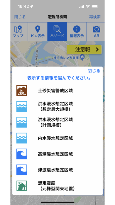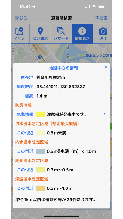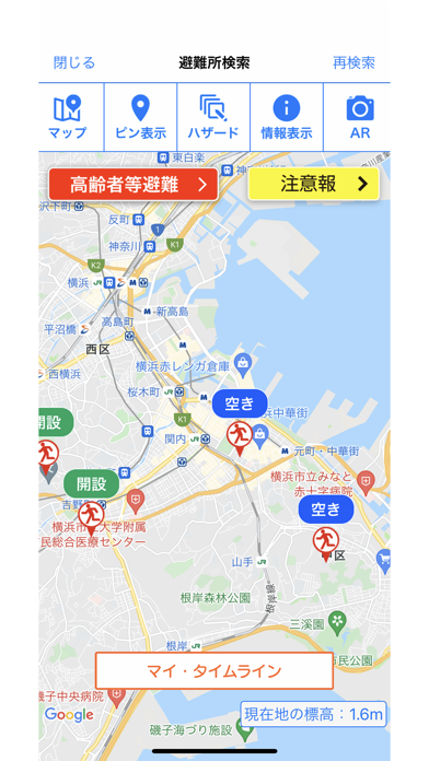 - 今いる場所の避難所や危険箇所がひと目でわかる地図表示