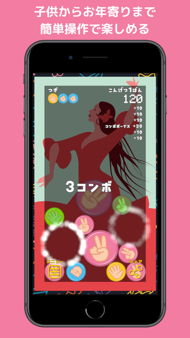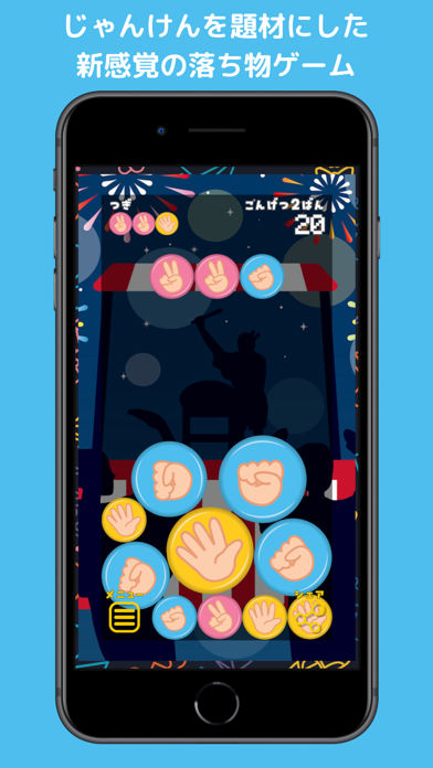 じゃんけんを知っていれば誰でも遊べるシンプルパズル。積み上がった「手」に対し、落ちてくる「手」が勝つよ、積み上がっている方の手が消えてスコア獲得。逆に落ちてくる「手」が負けると大きくなってしまいます。いかに勝てるように積むか、瞬時の判断がカギです。