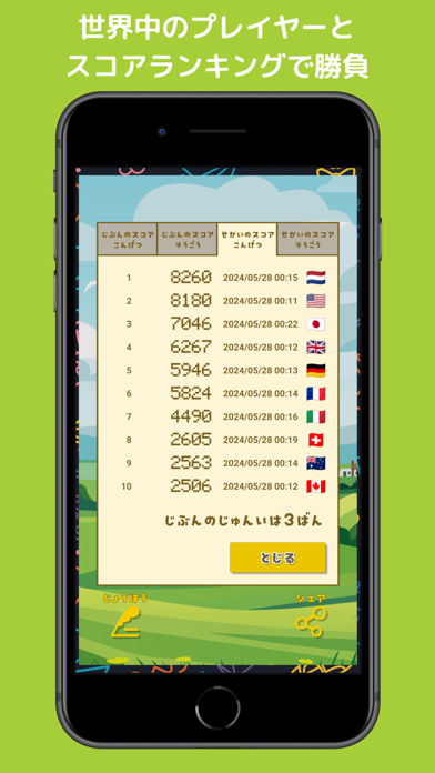 - 自己ベストや世界中のプレイヤーに挑戦するスコアシステムを搭載