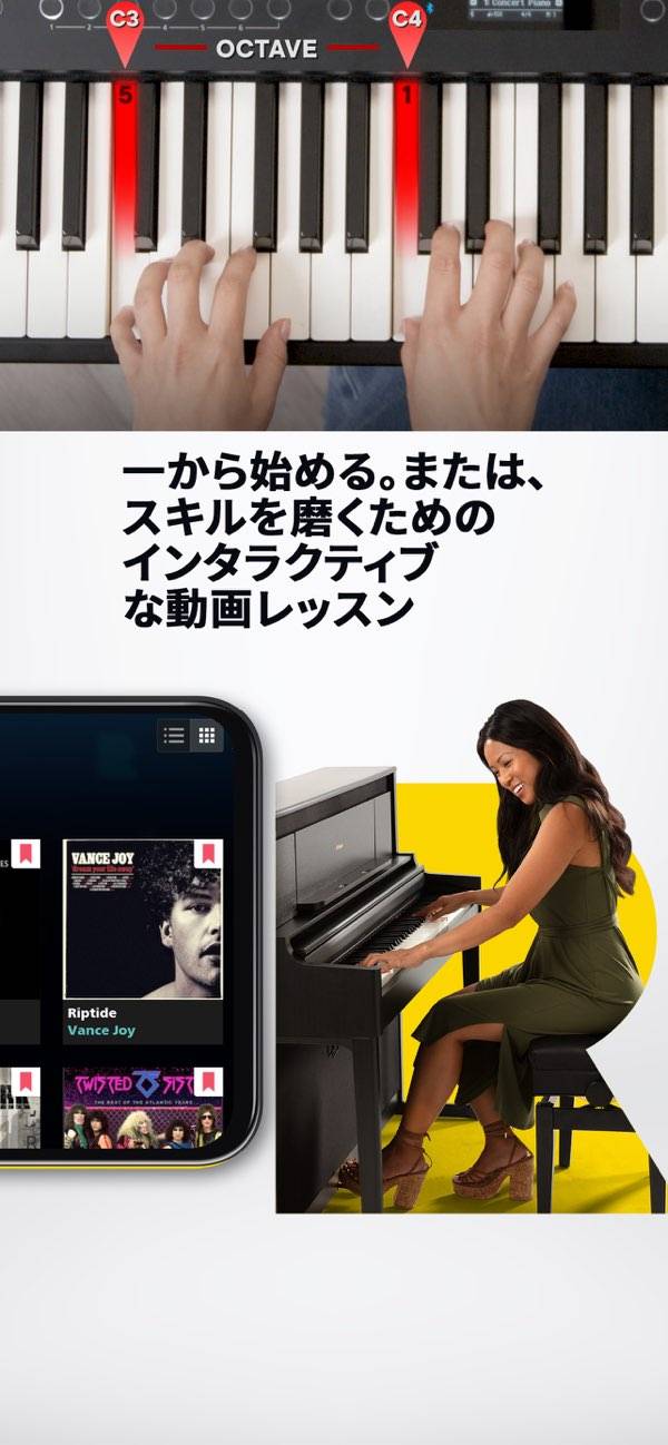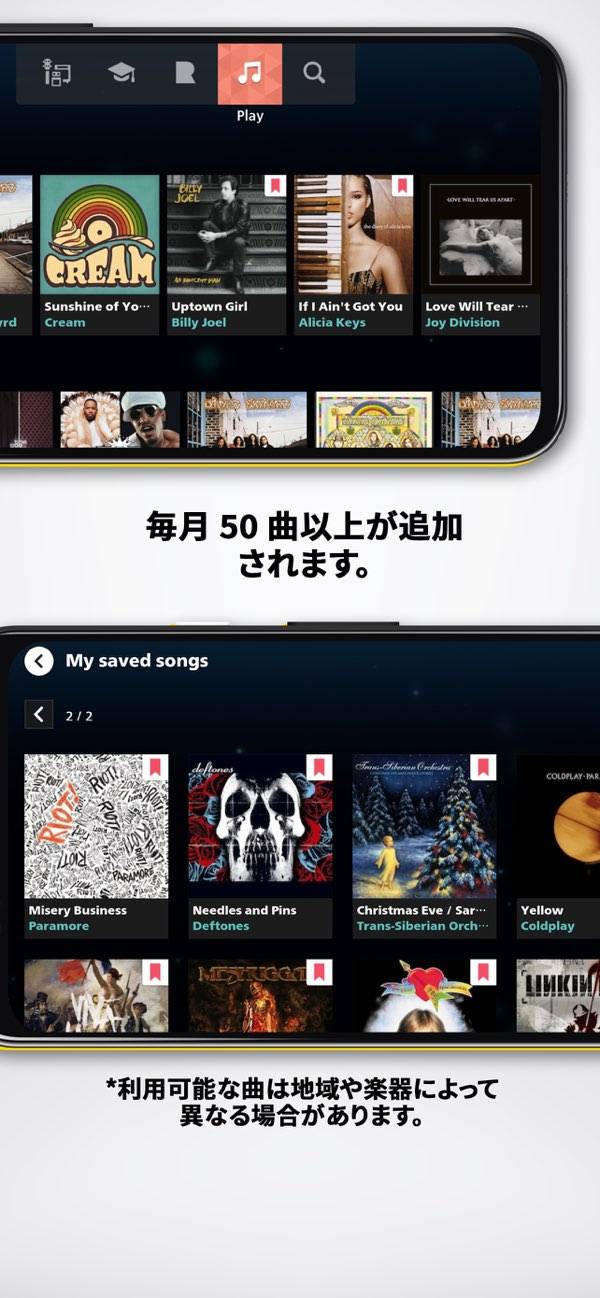 クラシックからポップス、ロック、R&Bまで幅広いジャンルの名曲を収録。自分の好きな楽器とジャンルを選び、個々の音楽的嗜好に合わせて楽しめます。新曲も定期的に更新されるため、常に新しい楽曲で練習できるのも魅力です。