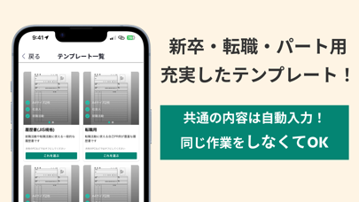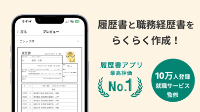 豊富なテンプレートとかんたん操作で、スマホだけで完成度の高い履歴書が作れるアプリです。自己PRや志望動機もキーワードを選ぶだけでAIが自動生成。