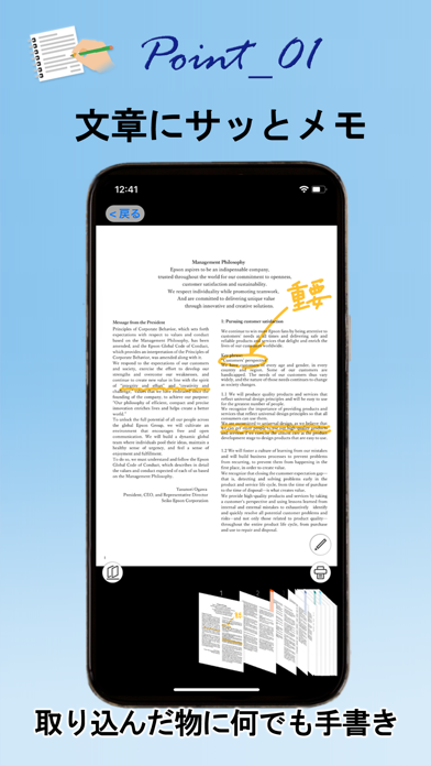手書きメモの作成ができるエプソン公式アプリです。スマホやスキャナーからPDFファイルを簡単に取り込み、紙のような操作感で閲覧や手書きメモが可能。また、エプソン製プリンターを使用して必要なページのみを選んで印刷できます。