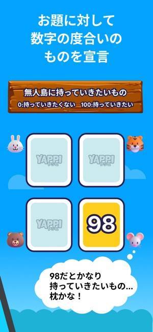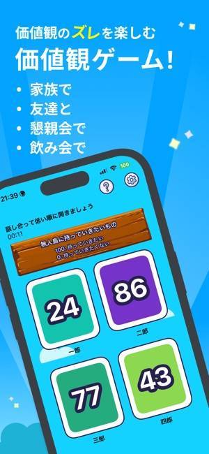 お題に対する価値観を共有し合うことで、普段は話題に上がらない会話ができるでしょう。仲が良い友達でも驚くような価値観が見つかることも。お互いに笑い合い、ツッコミ合いながら、ゲームを遊べます。