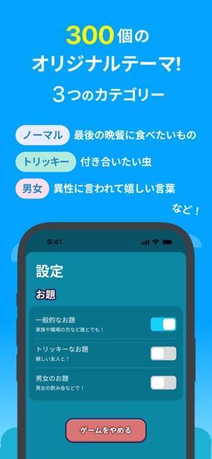 一般的なお題とトリッキーなお題、男女のお題と3種類のカテゴリーが選択可能。相手や場面に応じてゲームのお題を使い分けられるので、どんな人とでも盛り上がりやすいです。全カテゴリーを合計すると約300種類のお題があるため、何度でも楽しめますよ。