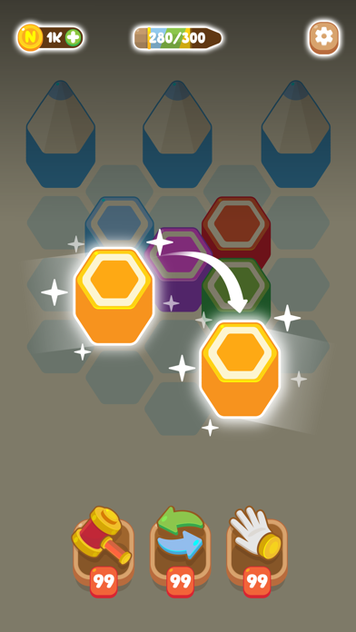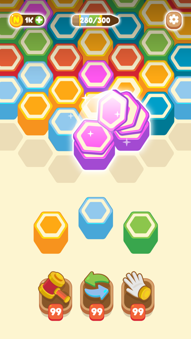 カラフルな鉛筆を用いたパズルゲームです。盤面にて、輪切りでペラペラの六角形のピース(鉛筆?)を配置していきます。同じ色のピースを横並びにすると、自動的に重なり合って(ソート)、一定数集めると鉛筆が完成します。ステージ規程の鉛筆を完成させればクリアですよ。