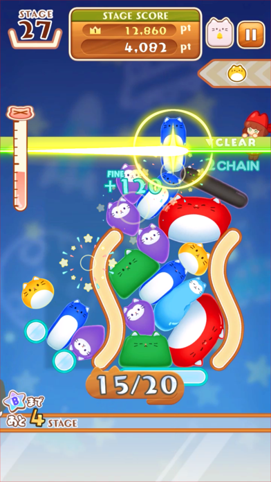 猫玉を20個積み上げるか、CLEARのラインに達すると「おかわり」達成です。猫玉がリセットされ、お皿の形状の形状も変化。たくさんおかわりをして、ハイスコアを目指しましょう。