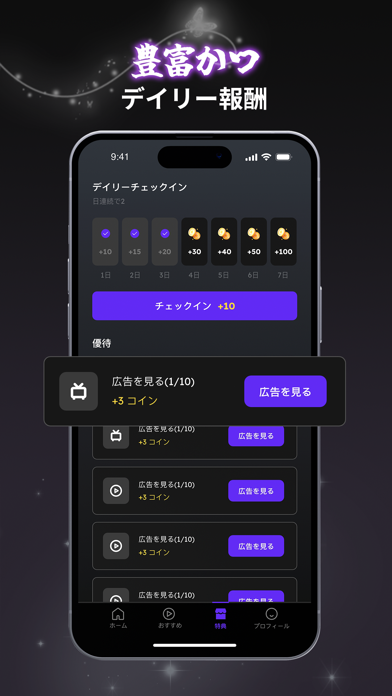 1作品あたりおよそ80~90話ほど、10話あたりまで完全無料で観られます。有料分のエピソードは1話55コインで開放可能。コインは有料購入のほか、デイリーチェックイン(ログインボーナス)や奨励(ミッション)でも獲得できます。