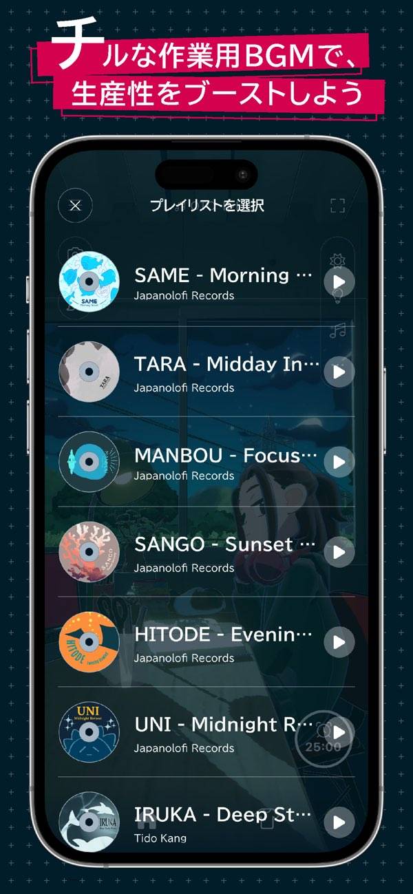 作業集中アプリとしても抜かりなし。ポモドーロタイマーはもちろんのこと、落ち着いた雰囲気のLofiミュージックも多数収録。