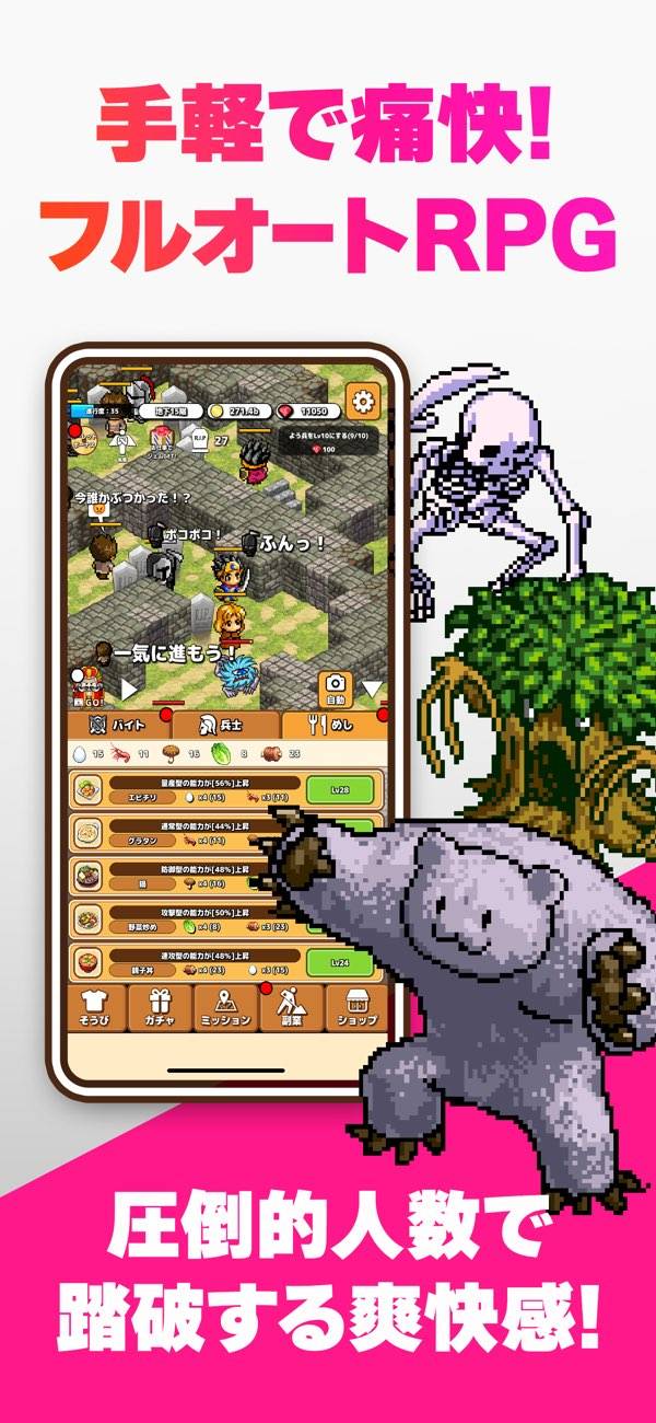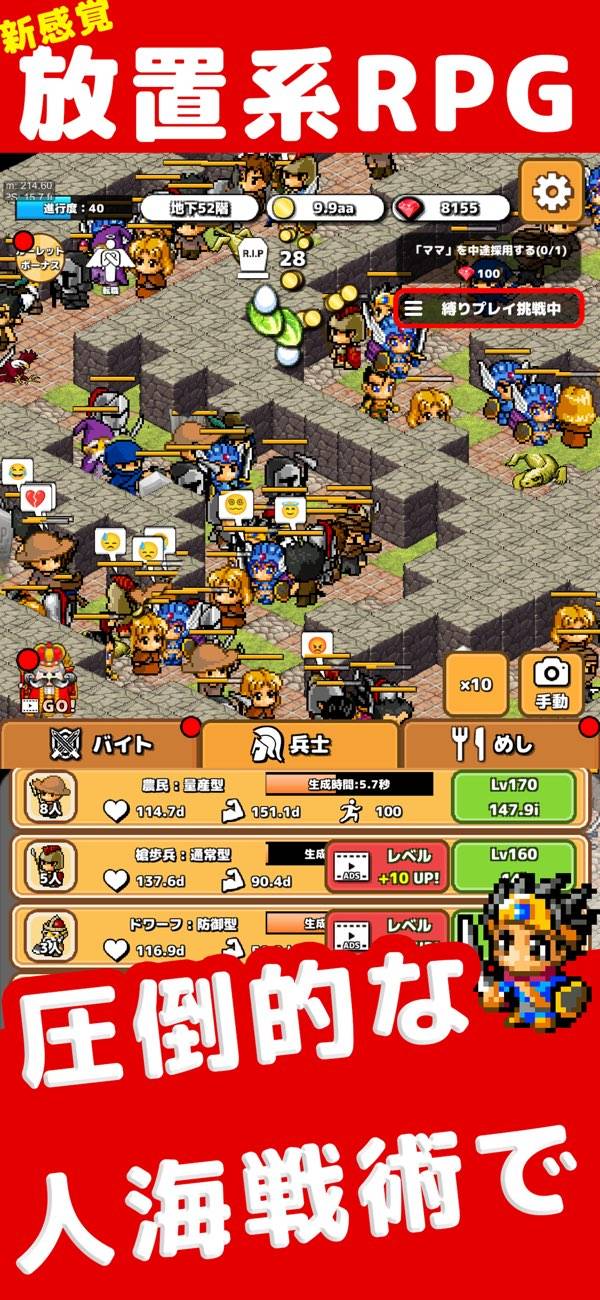 あなたの役目はお金を稼ぎながら、大量の仲間たちを連れてくることです。バイトでお金を稼いで、兵士をタップして仲間を召喚するのが基本的な流れです。勇者ひとりでは非力ですが、圧倒的物量で押し通せばダンジョンのひとつやふたつは攻略可能ですよ。