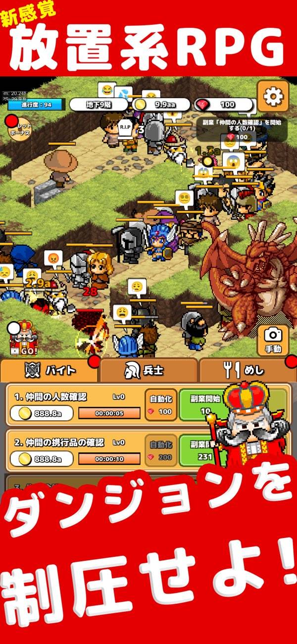 勇者の冒険を題材にしたクリッカー系放置RPGです。勇者をクビになった主人公が、ダンジョン攻略隊のマネージャーに就任します。圧倒的物量の仲間を引き連れ、ダンジョンを制圧し、地下99階にいる魔王を倒しましょう。ドット絵ファンタジーRPG風の仲間たちが魅力的ですよ。