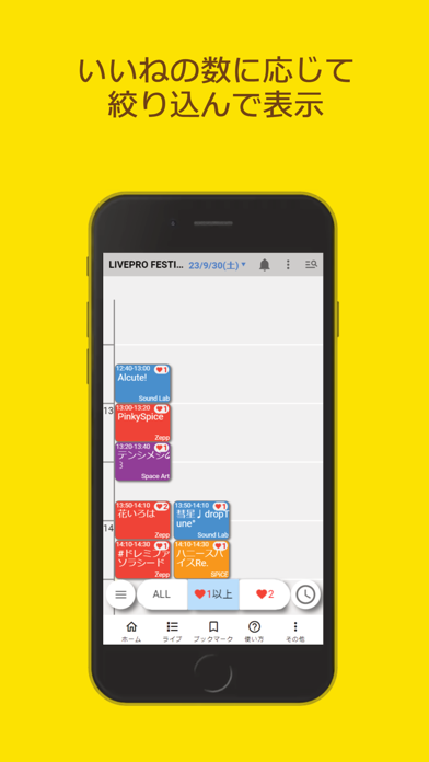 いいねを付けたアーティストだけを、タイムテーブル上の表示できます。フェスやライブイベントのタイムテーブルは複雑になりがちですが、この機能のおかげで、効率的にライブの計画を立てることが可能です。