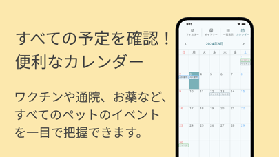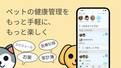 ペットの健康管理を一元化できるアプリです。通院、投薬、血液検査、体調管理などの重要な情報をカレンダー形式で簡単に管理できます。複数のペットを登録し、各ペットのスケジュールを一目で確認できるのが最大の特徴。忙しい日常でもペットのケアを怠ることなく、最適なタイミングで必要なケアを行えます。
