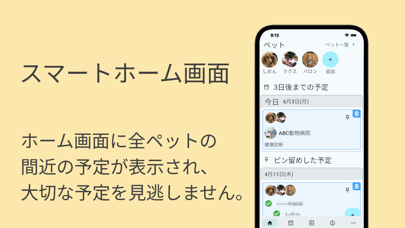 ホーム画面では直近の予定や重要な予定を一目で確認できます。これにより、忙しい日でもペットのケアを見逃すことなく、最適なタイミングで必要なケアを行うことが可能です。
