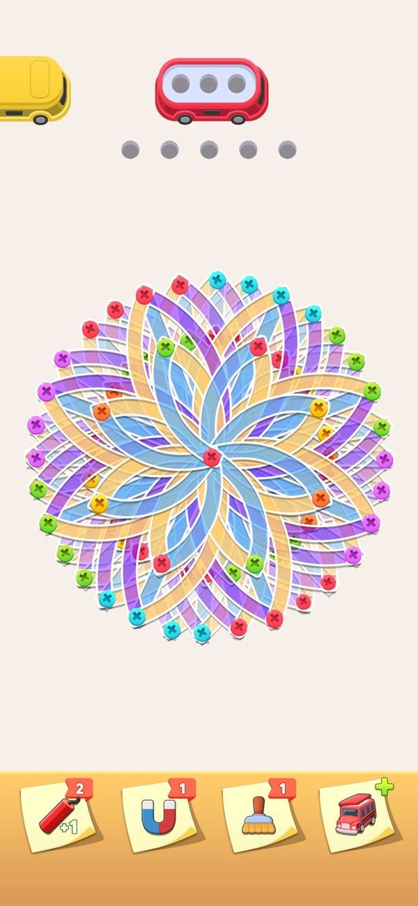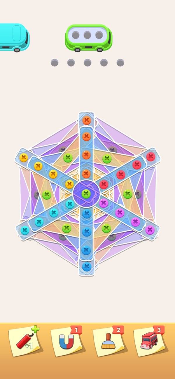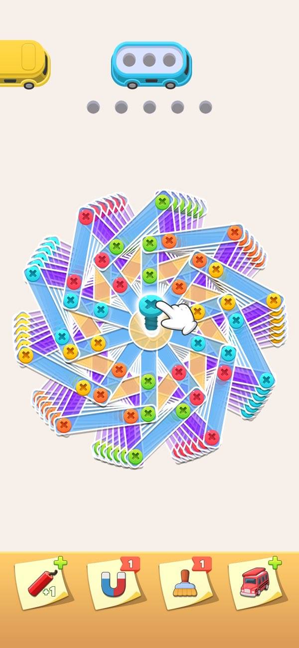 重なったプレートのネジを外すパズルゲーム。ネジの色に対応したネジ穴があり、順番にネジを外して入れていく必要があります。