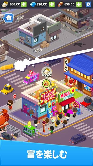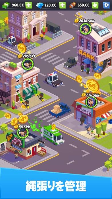 仲間であるアウトローを施設に配置し、金をどんどん巻き上げていきましょう。アウトロー(仲間)が資金を貯めてくれるため、タップで回収。得た資金で施設をレベルアップし、さらに効率的に資金回収が可能に。資金を一定量集めること自体が目的です。