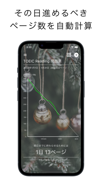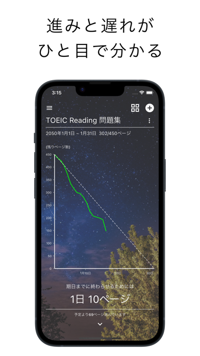 参考書のページ数、勉強の開始・終了期日を設定すると、1日に進めるべきページ数を計算。加えて、本来進めるべきペースと実際のペースをチャートで見比べながら、意識して勉強に取り組める寸法です。
