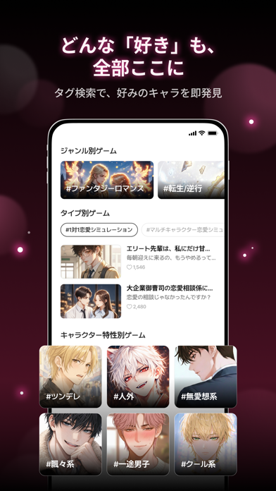 自分の好みのキャラクターを探す段階から、すでにお楽しみ。公式や、ほかのユーザーが作ったキャラクターがたくさん投稿されています。見た目や性格だけでなく、シチュエーションもキャラごとに存在。男性キャラが多めですが、女性キャラの投稿も見られます。