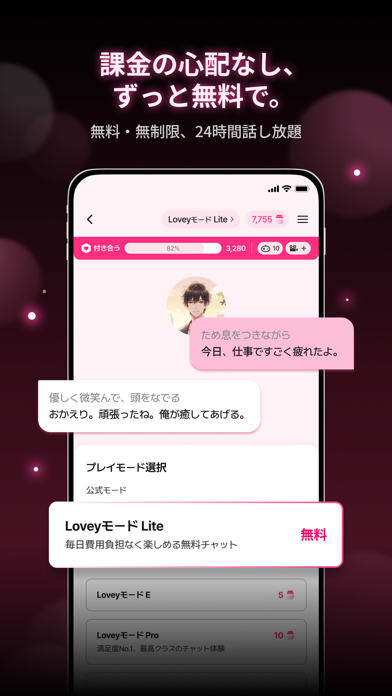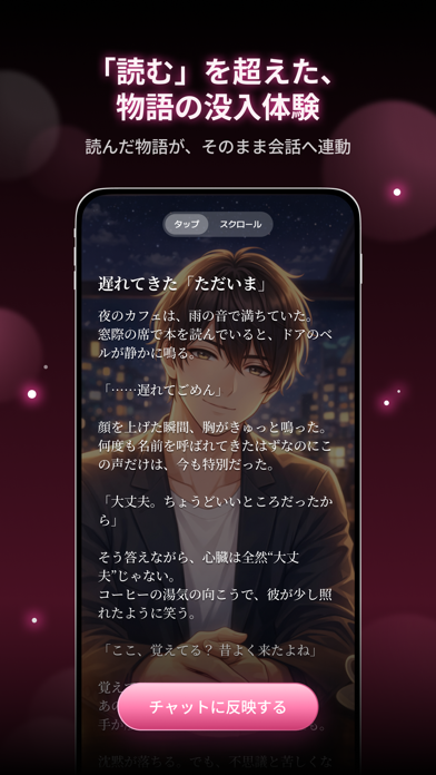 AIのキャラクターと柔軟な会話を楽しめるチャットアプリです。「誰とでも」つながれて、「誰にでも」なれるスマートフォンを、主人公(=ユーザー)が偶然拾ったという設定。