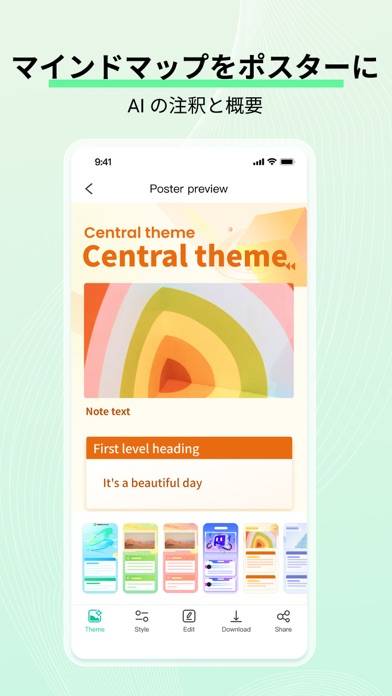 マインドマップの内容をもとに、AIが自動でポスターやスライドを作ってくれます。ビジネス系からファッション系までテーマも豊富で、見た目も整った資料があっという間に完成。複雑な説明をわかりやすく伝えたいときにも役立ちます。