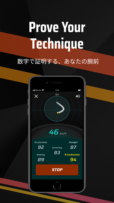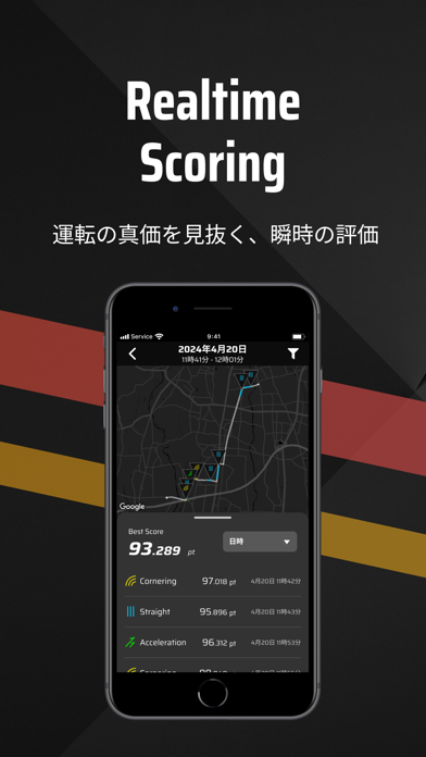 自分の運転技術がリアルタイムで反映されます。評価項目は加速、減速、 旋回、 直進、複合の5種類。ハンドル、アクセルの両方に気を配る必要があります。なお、アプリ内にも注意喚起がありますが、運転中はスマホの操作をしないように注意しましょう。