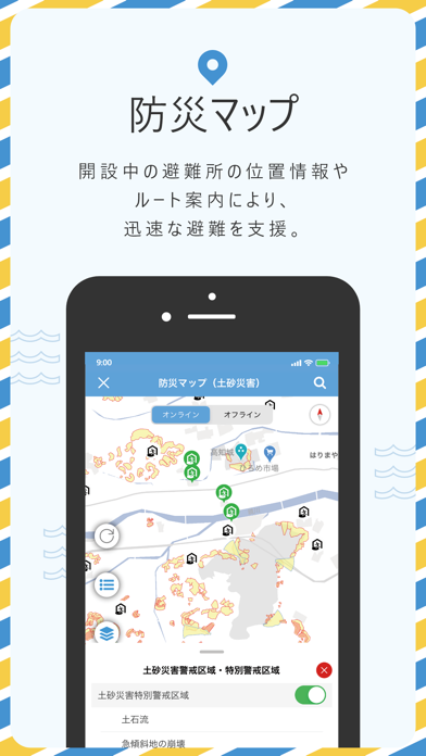 災害時に被害を想定しつつ、避難場所を探せます。地震や津波などの災害種別に合わせ、危険な場所が色分け表示。避難場所の表示と経路案内も利用できます。