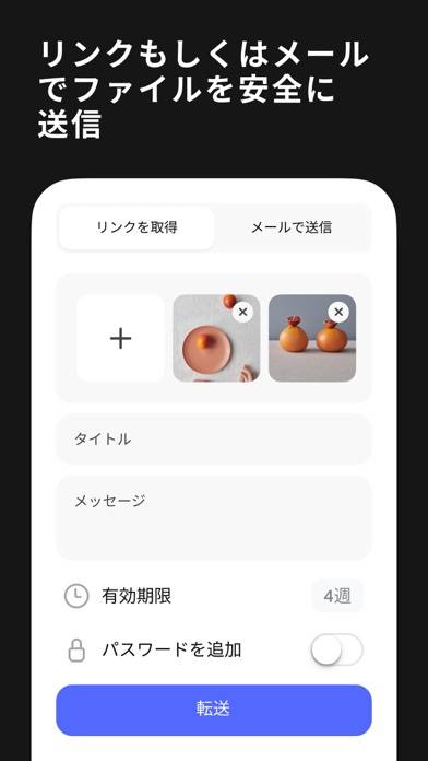簡単に使えるファイル転送アプリです。送信したいファイルを選ぶだけでOK。あとは画面の指示に従い、メールアドレスを入力するか、URLを取得するだけ。無料版でも一度に2GBまで共有可能。画像、動画、pdfなど、たいていのファイル形式に対応しています。