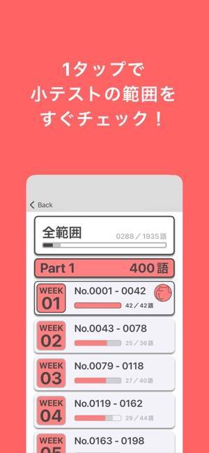 本アプリ1本で参考書1冊分の大ボリューム。『LEAP』を参考に収録された1,935単語を学習できます。進捗がグラフで表示されるのも、デジタルならではのメリット。