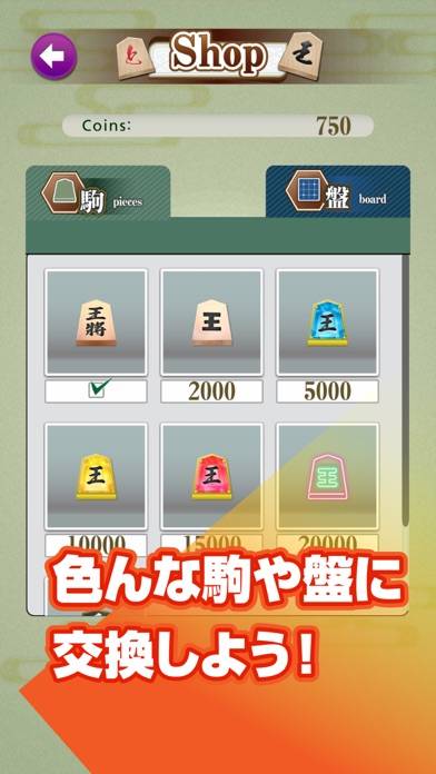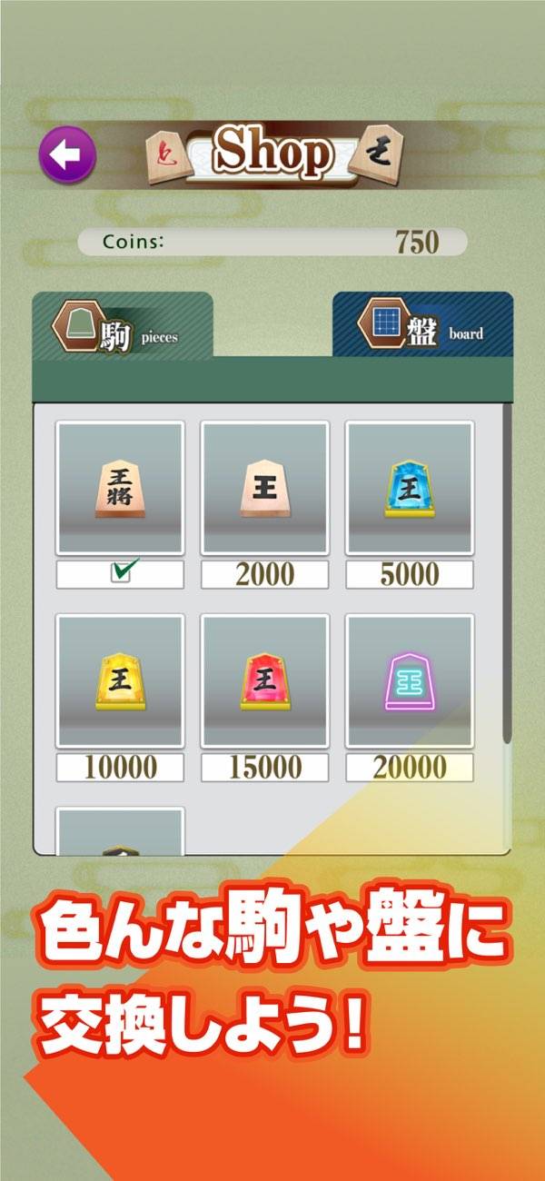 将棋を遊ぶと溜まるコインを払うことで、新たな駒と盤を使えるようになります。初期状態では「これぞ将棋」と言わんばかりの木の駒と盤。ですがサイバーチックな駒など、奇抜なデザインの数々が並びます。少しだけふつうではない将棋を楽しみたい人はぜひ。