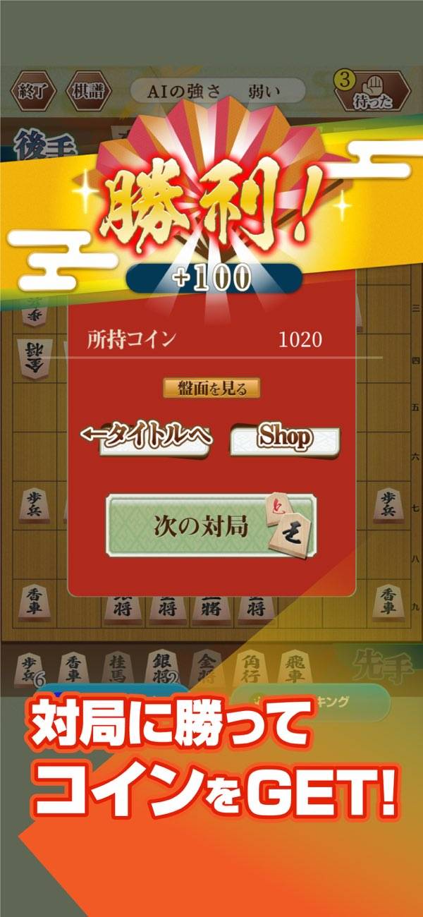 - 3段階のAI+手合の設定に対応。初心者でも勝ちやすい工夫あり