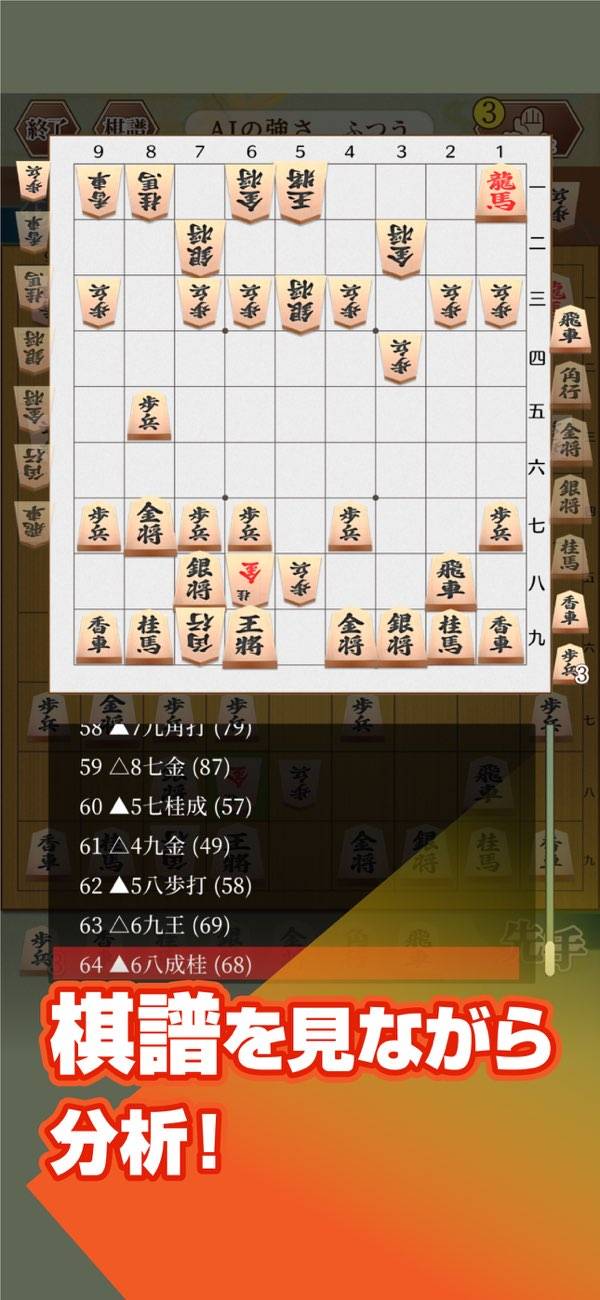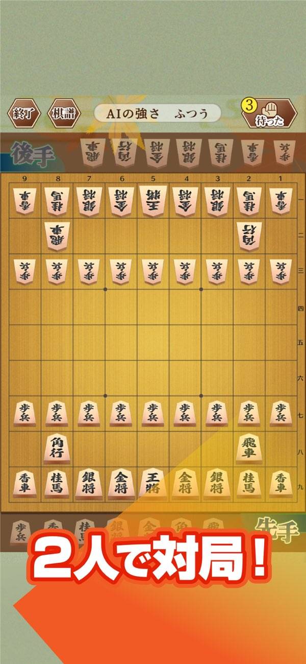 AIとの対戦と、1台のスマホで2人対戦の両方に対応。成績の記録や棋譜の表示機能もばっちり搭載されています。とにかくふつうに将棋で遊びたいときにぜひ。