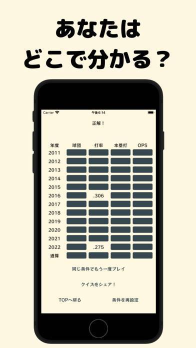 プロ野球のデータに自信のある者、来たれ! プロ野球の選手成績に焦点を当てたクイズゲームです。年ごと+通算の球団・打率・本塁打・OPSなどの成績をもとに、どの選手を示すのかを推測。