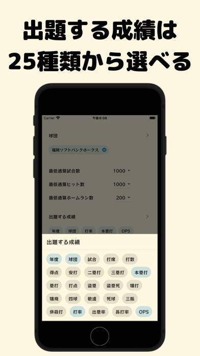 表示する成績や、対象球団を細かく設定できます。難しすぎると感じた場合は、出題の対象を1球団に絞るなどで調整可能。逆に難易度を上げたい場合は「出題する成績」から「球団」をオフにすると手応えのある難易度に。そのほか、打点や盗塁を出題対象にできます。