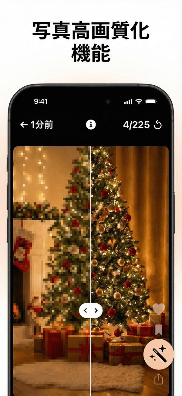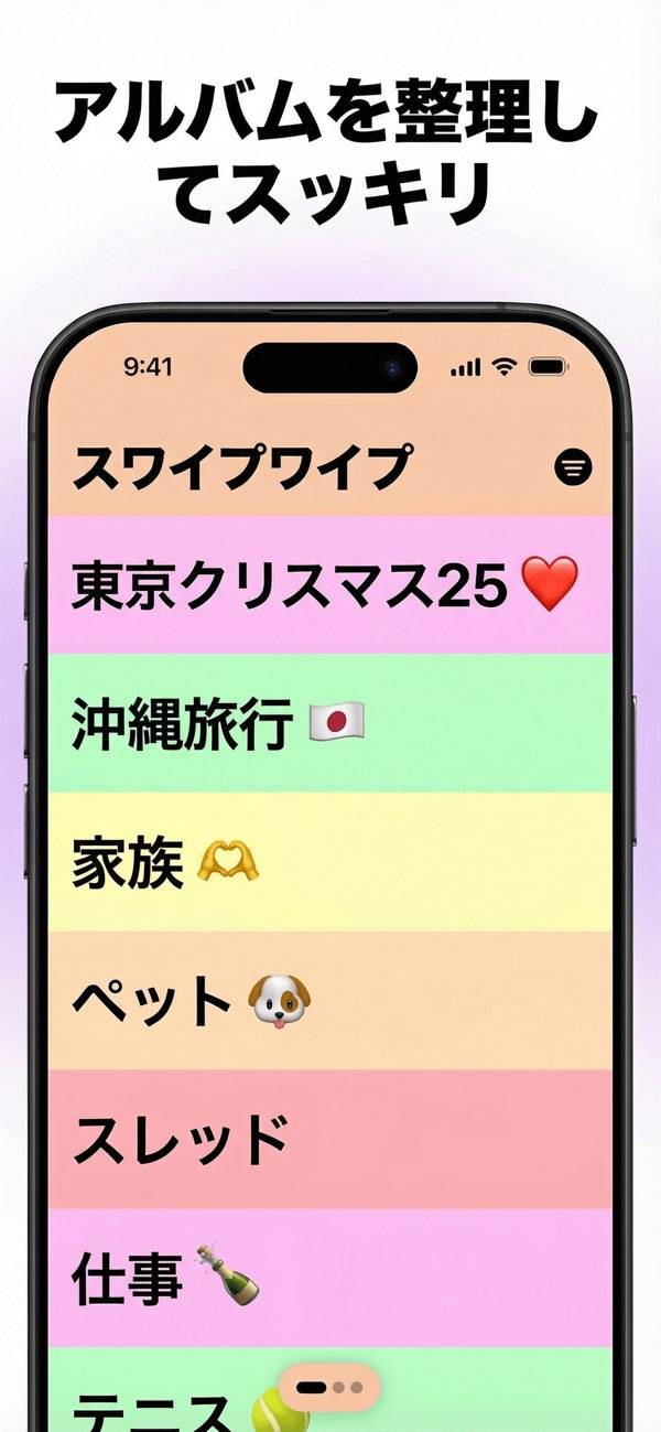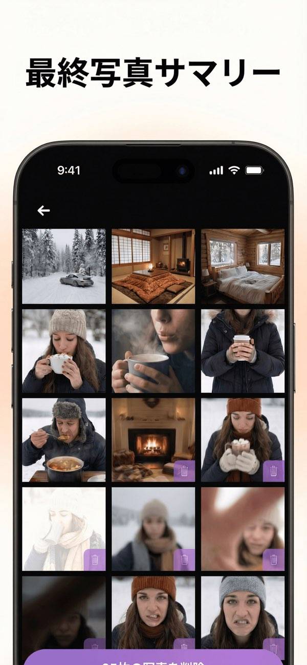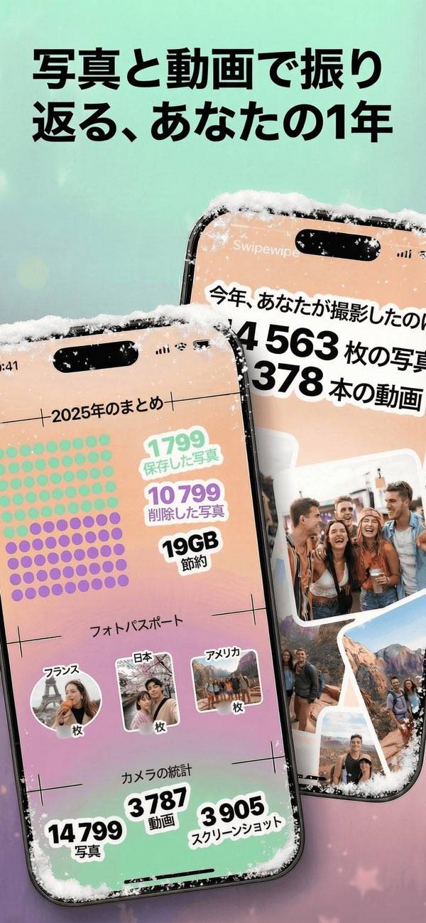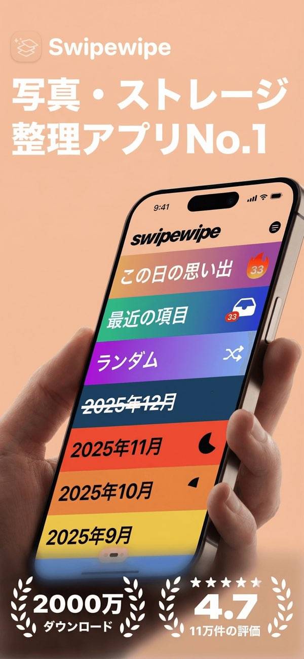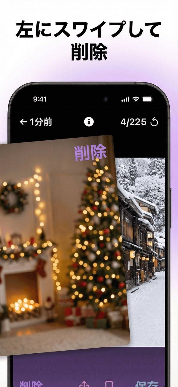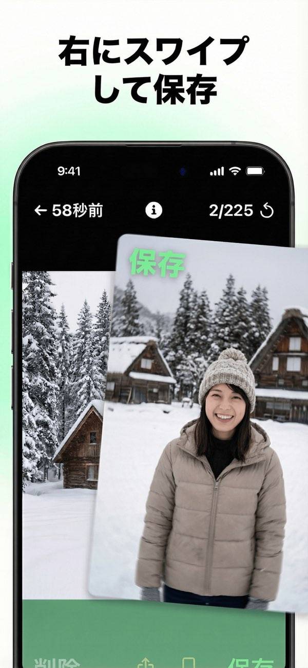 手軽に写真整理ができるアプリ。スワイプ操作によって、写真を直感的に整理できます。右にスワイプで保存、左にスワイプで削除、長押しでメタデータ確認といったシンプルな操作性が魅力です。また、「この日」機能を活用することで、過去の思い出を振り返りながら楽しく整理可能。