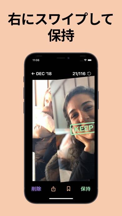 写真を保持するには右にスワイプし、削除するには左にスワイプするだけで整理可能。間違えた場合は、現在の写真をタップして元に戻せます。手軽にサクサク整理しながら、ミスした時も安心なので使いやすいです。
