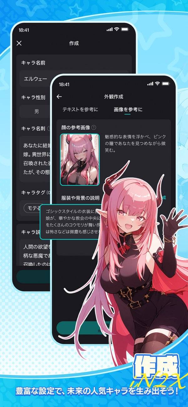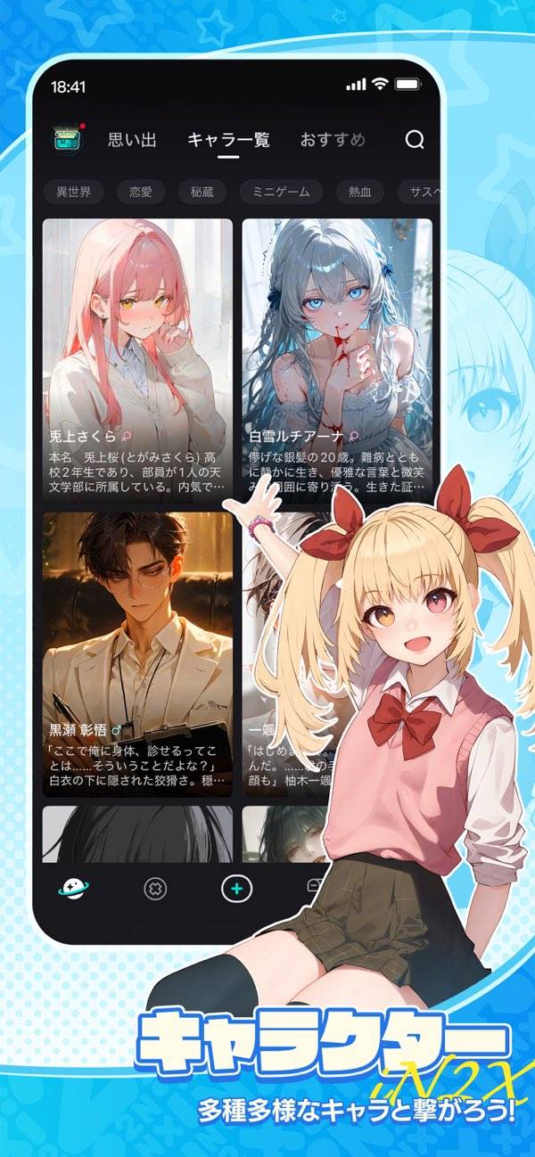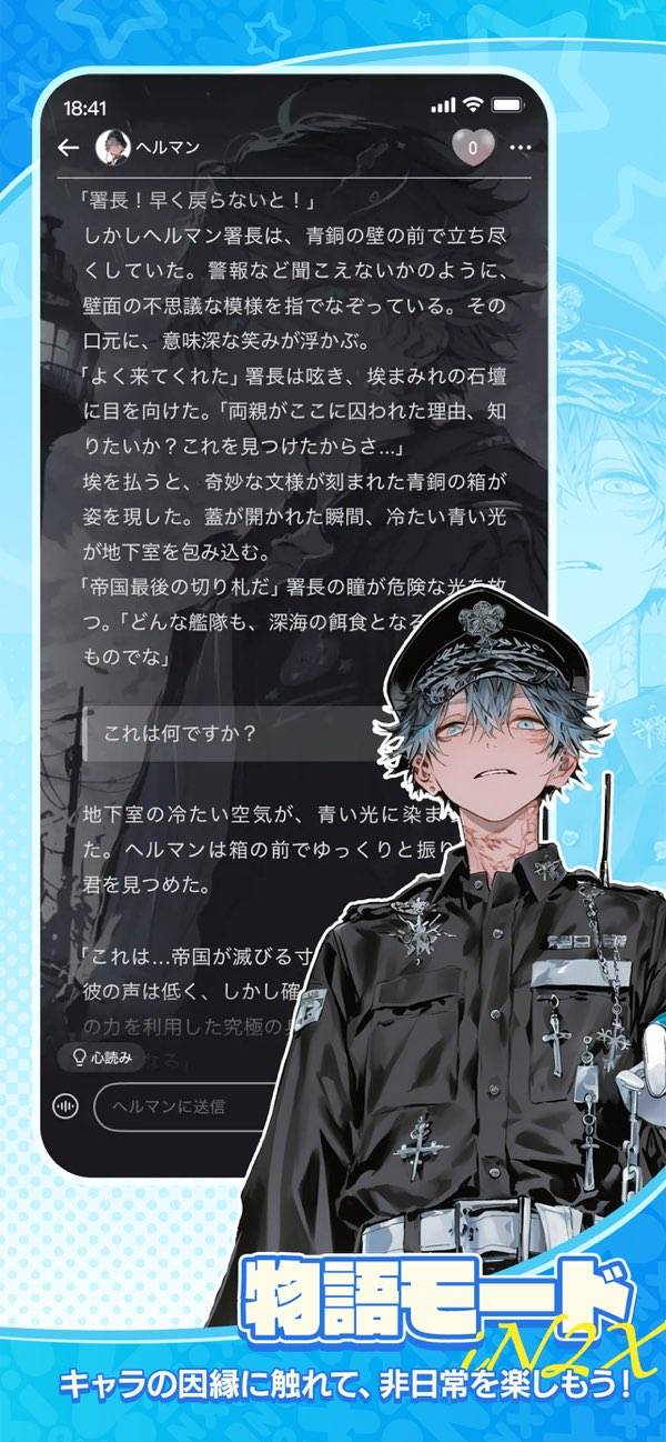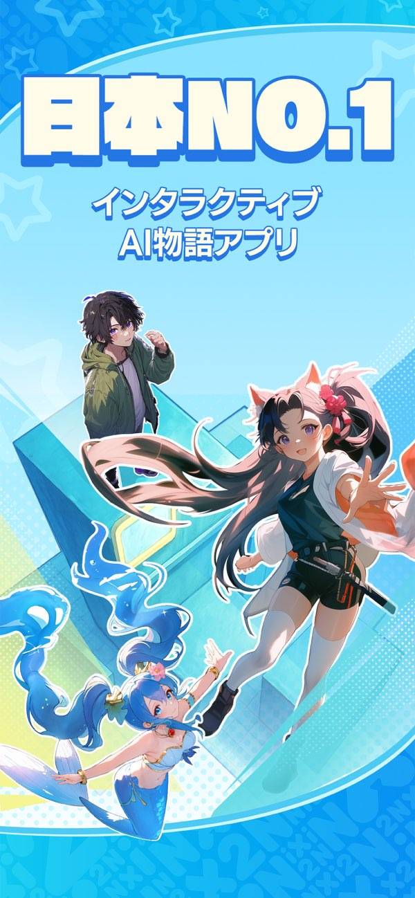 AIの架空キャラと会話できる系の一種。チャットだけでなく物語風に楽しめるのが新鮮です。チャットだとイマイチ盛り上がりに欠けたり、次にどんな話題を振るか悩みがちになるのですが、物語風だと情報量が多いせいかやりとりを続けやすいです。