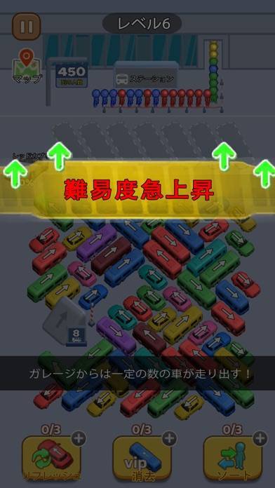 行き詰ったときは、駐車枠を増やすこともできます。序盤ステージでは最大3枠まで増加可能。ゲームオーバーになると駐車枠もリセットされてしまいます。