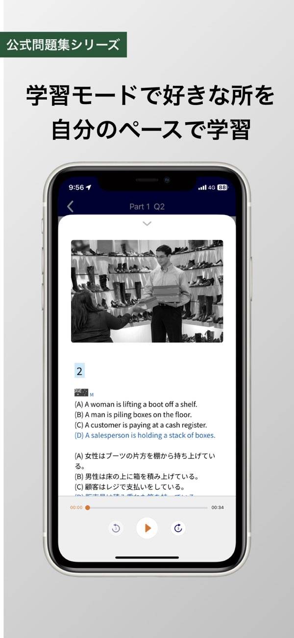 アプリ内でTOEICの公式問題集を購入し、そのまま学習に移れます。対応教材は『新形式問題対応編』と公式問題集の1~8。加えてアプリ限定のパート別問題集も配信されています。