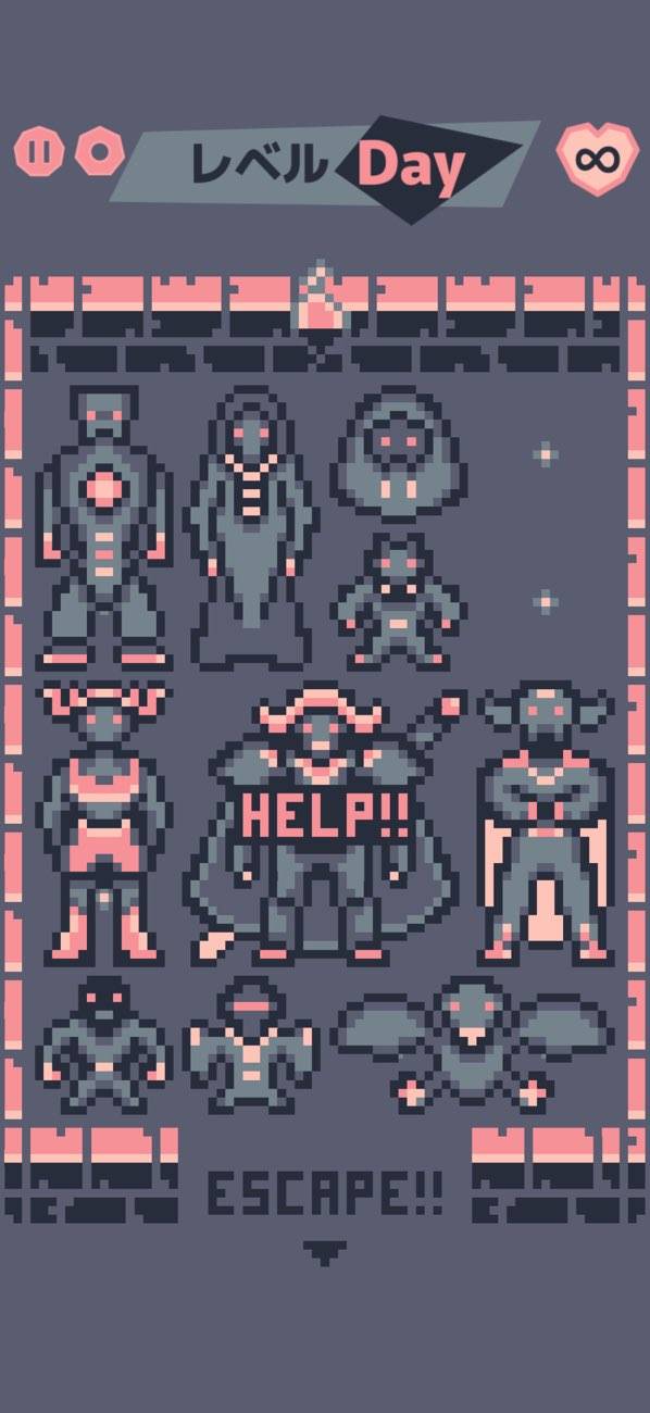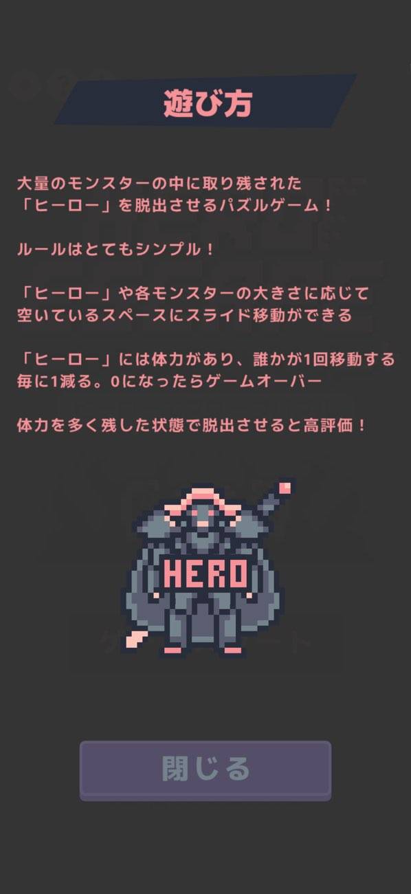 ルールとしてはオーソドックスなスライドパズルが踏襲されています。ヒーローとモンスターをスライドさせ、ヒーローを「ESCAPE!!」まで導けばクリア。