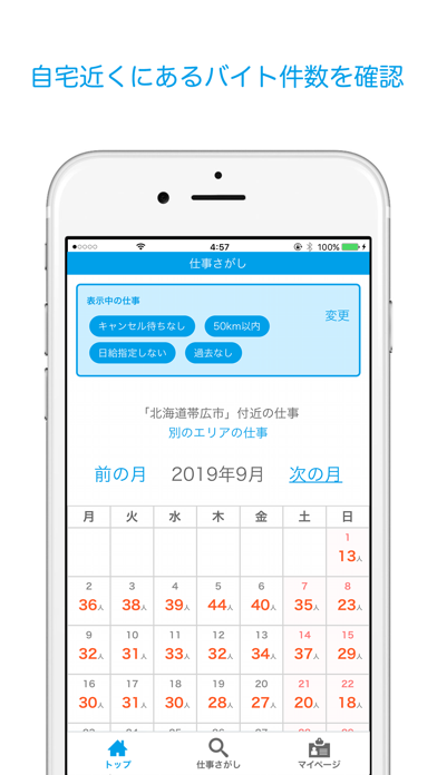 働きたい地域を指定すれば、日ごとの募集人数がカレンダーに表示されます。働ける日をタップすると現在の募集が一覧表示。