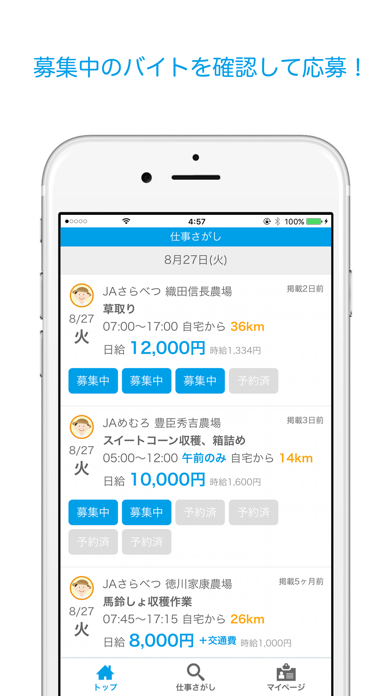 農業専門かつ1日単位のバイトアプリです。さつまいもの収穫や柿のつるしなど、農家にとっても人手が欲しい募集がズラリ。北海道から沖縄まで、全国に幅広く対応しています。