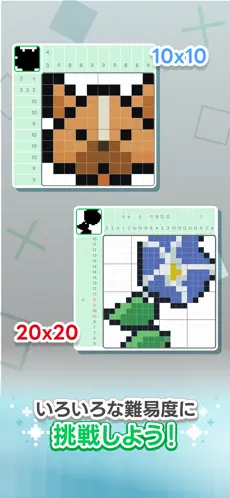 画面上と左の数字に沿って、当てはまるマスを黒く塗ります。当てはまらない部分には✕を付けていくシンプルなロジックパズルです。3回ミスしてしまうとゲームオーバーと条件が厳しいですが、ヒント機能や、途中から再開できる機能が搭載されています。