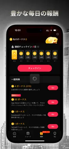 毎日の連続チェックインや特典で、無料コインが獲得できます。とくにチェックインでは1日に30~90コインがもらえるのでお得。1話50コインでアンロックできるため、コツコツためていけば無課金でも全話見られます。