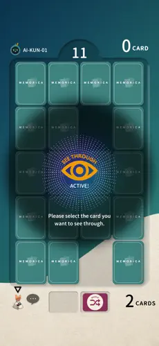 本作では透視、シャッフル、暗闇、3カードの4種のスキルカードが登場。対戦前に4種類のうち2個をセットし神経衰弱に挑みます。
