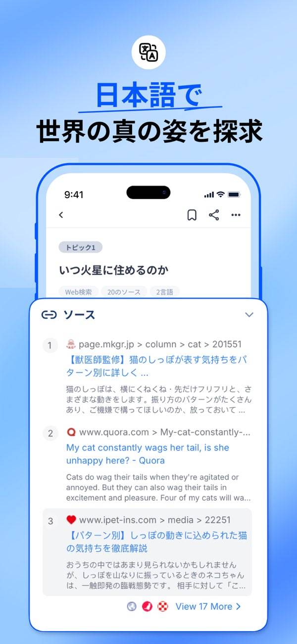 AIが質問に答えてくれる検索アプリです。英語やほかの言語で書かれた情報も検索・要約でき、信頼できる答えをスピーディに取得。RedditやX(旧Twitter)などからもリアルタイムの関連情報を集めてくれるので、ネットのあちこちを探す手間がなくなります。