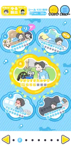- パズルの結末に応じた場面のシールを獲得。失敗しても成功しても楽しい